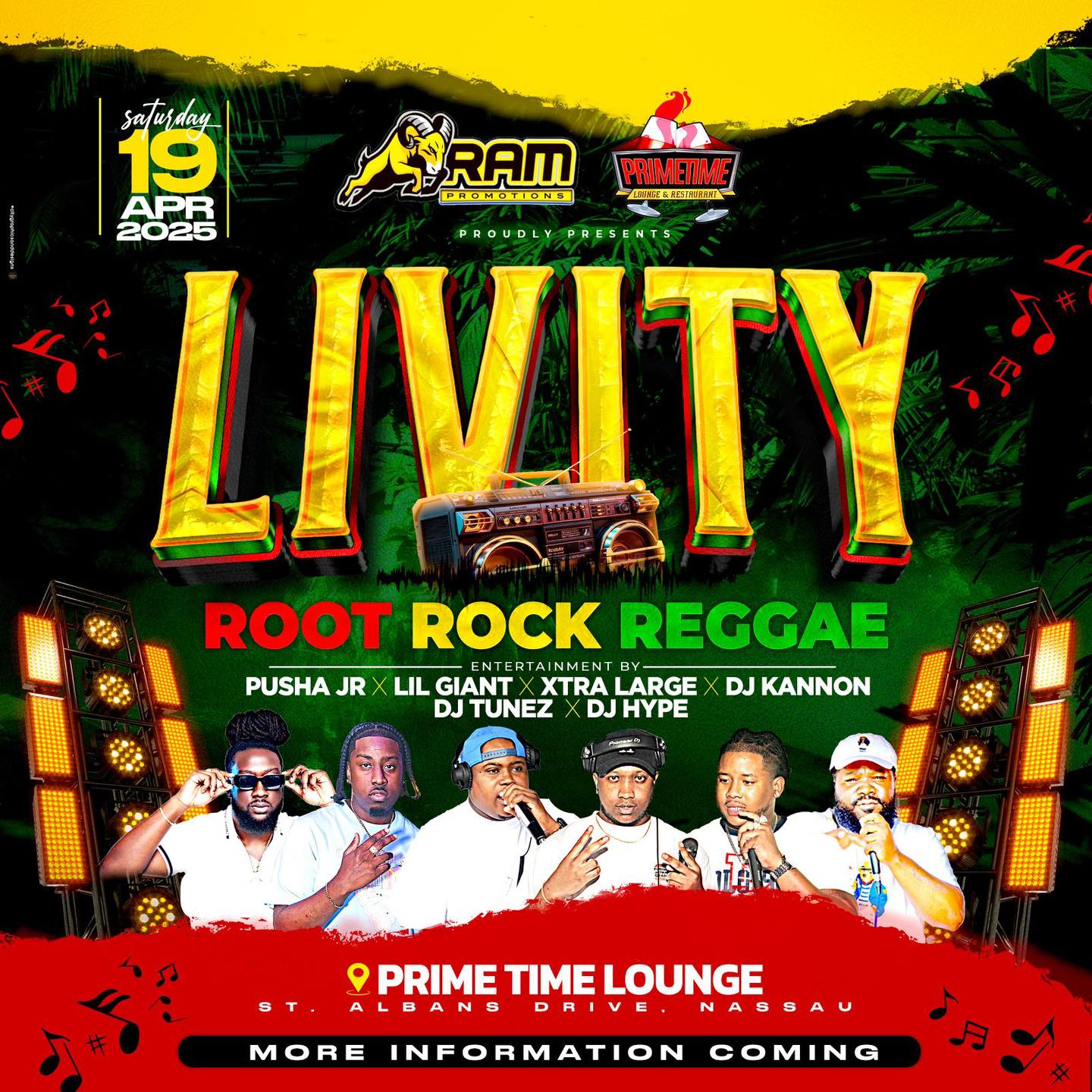 April 19 @ 9:00 pm Livity: Roots Rock Reggae Primetime Lounge Saint Albans Drive, Nassau, NP, Bahamas LIVITY ROOT ROCK REGGAE SATURDAY APRIL 19THSAVE THE DATE